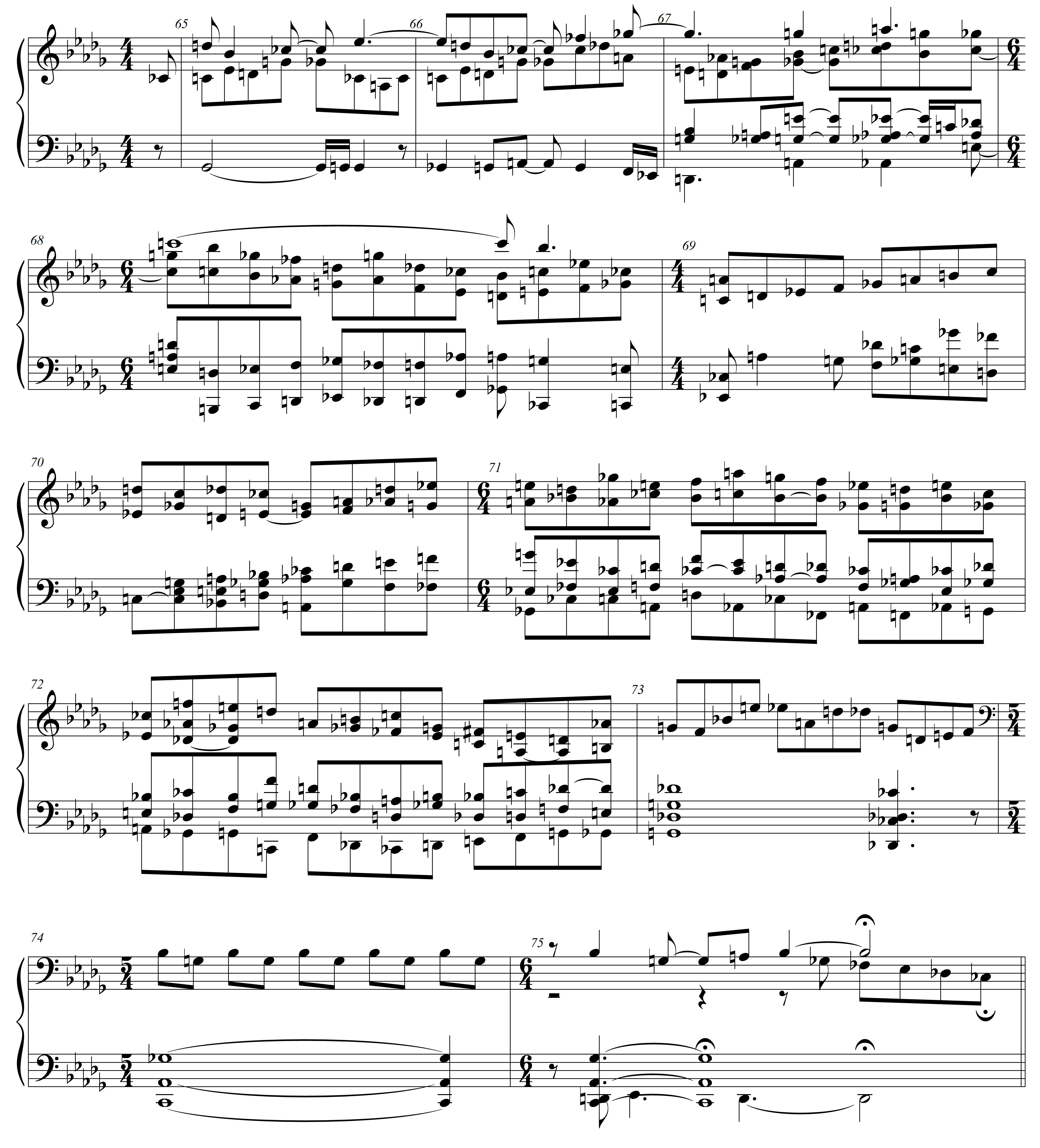 Two-staff reduction of the second subject’s continuation phrase, measures 65–75
