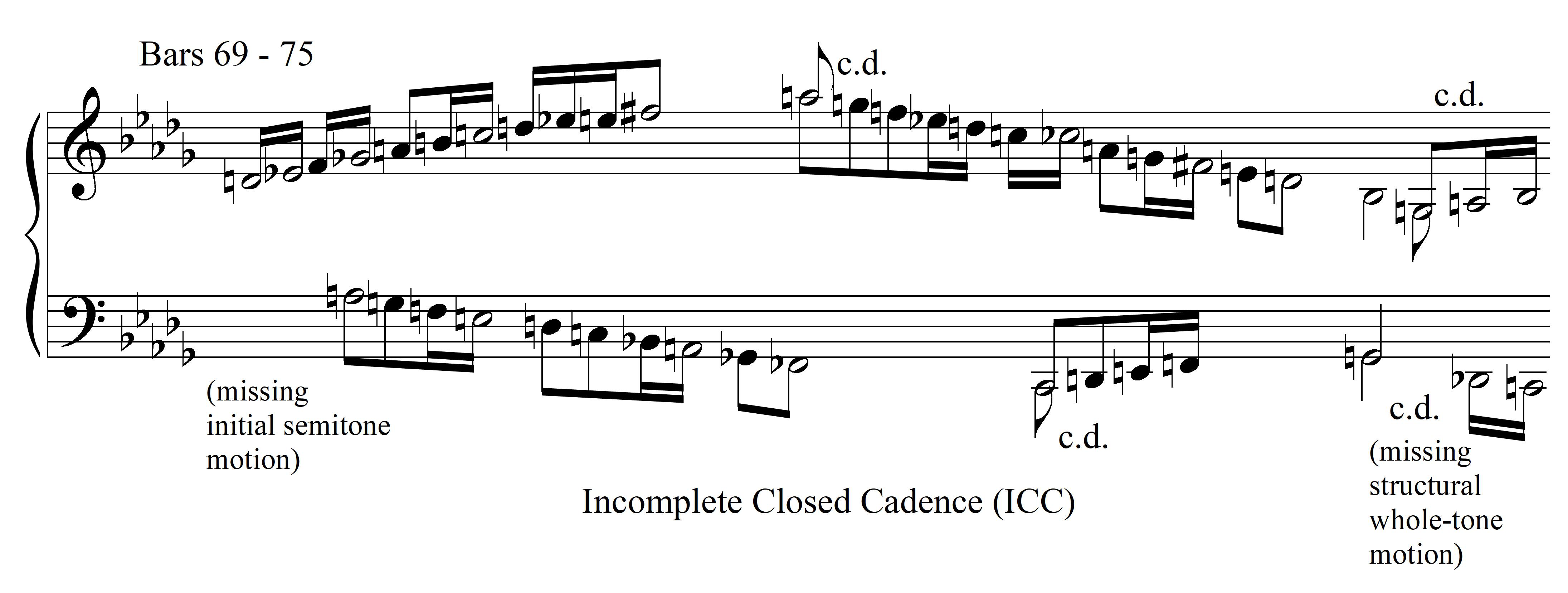 Example 24. Atonal voice-leading structure of the second subject’s continuation phrase, measures 69–75: incomplete closed cadence
