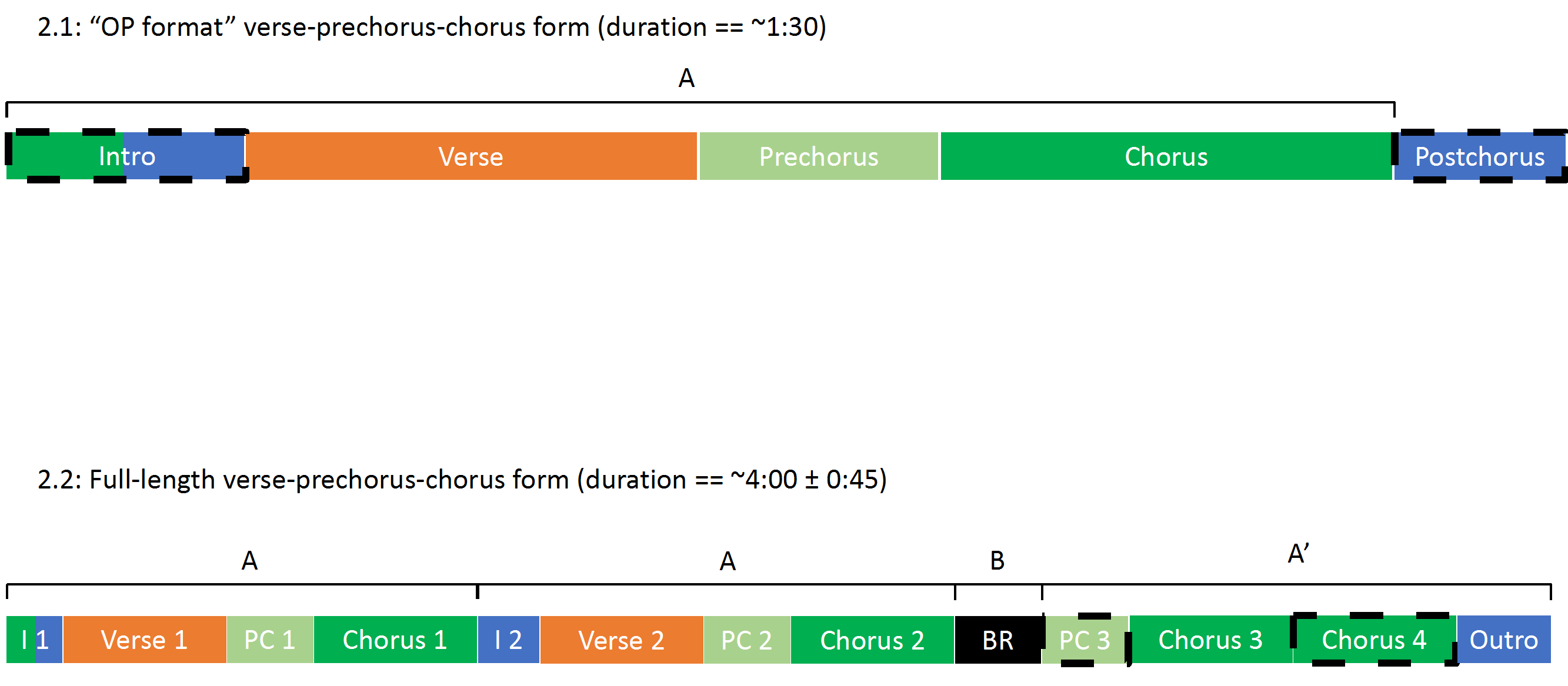 Example 2. Form graphs of the (2.1) “OP-format” and (2.2) full-length anime song (length and colors of bars represent normative sectional durations and thematic content, respectively; dashed borders represent sections frequently omitted)