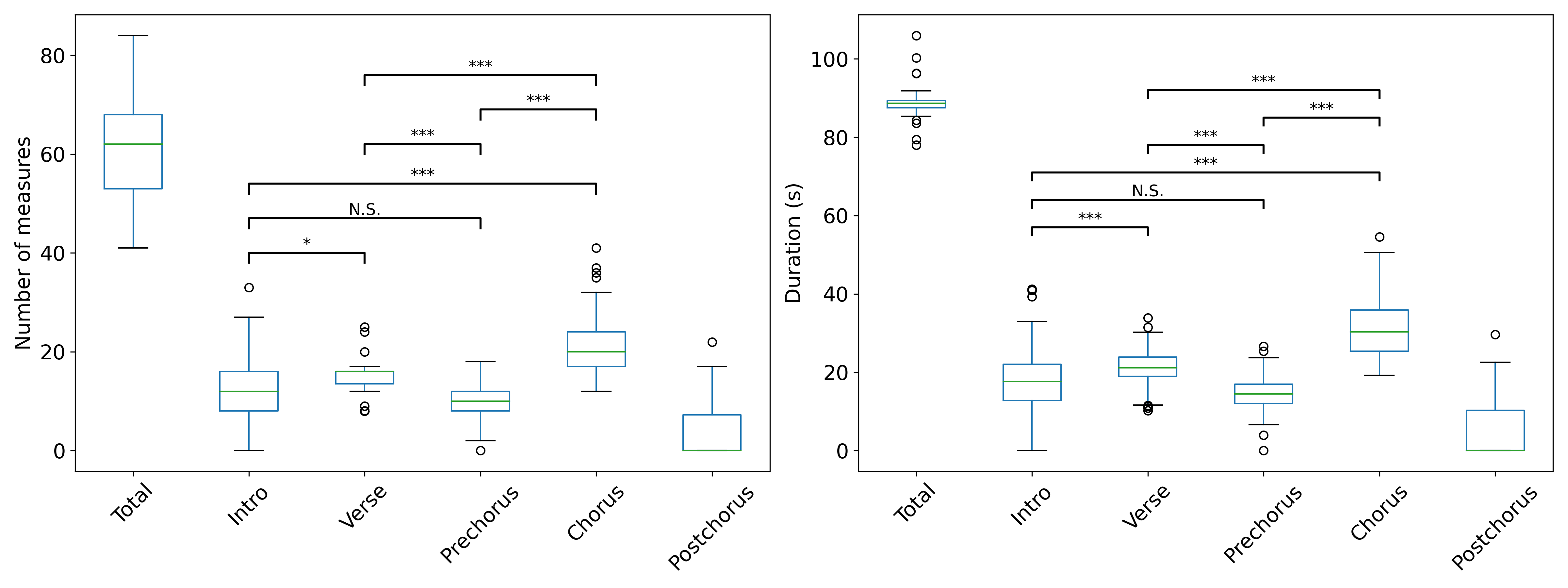 Example 3. Boxplot of (3.1) measure counts and (3.2) durations for each section in OP-format anime songs from top-popularity TV anime; (3.3) boxplot of tempo distribution of OP-format anime songs with versus without postchoruses
