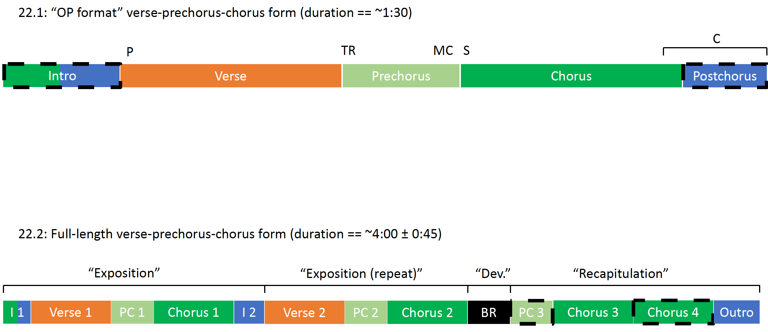 Example 22. Hybrid sonata/verse-prechorus-chorus form graphs of the (22.1) “OP-format” and (22.2) full-length anime song (length and colors of bars represent normative sectional durations and thematic content, respectively; dashed borders represent sections frequently omitted)