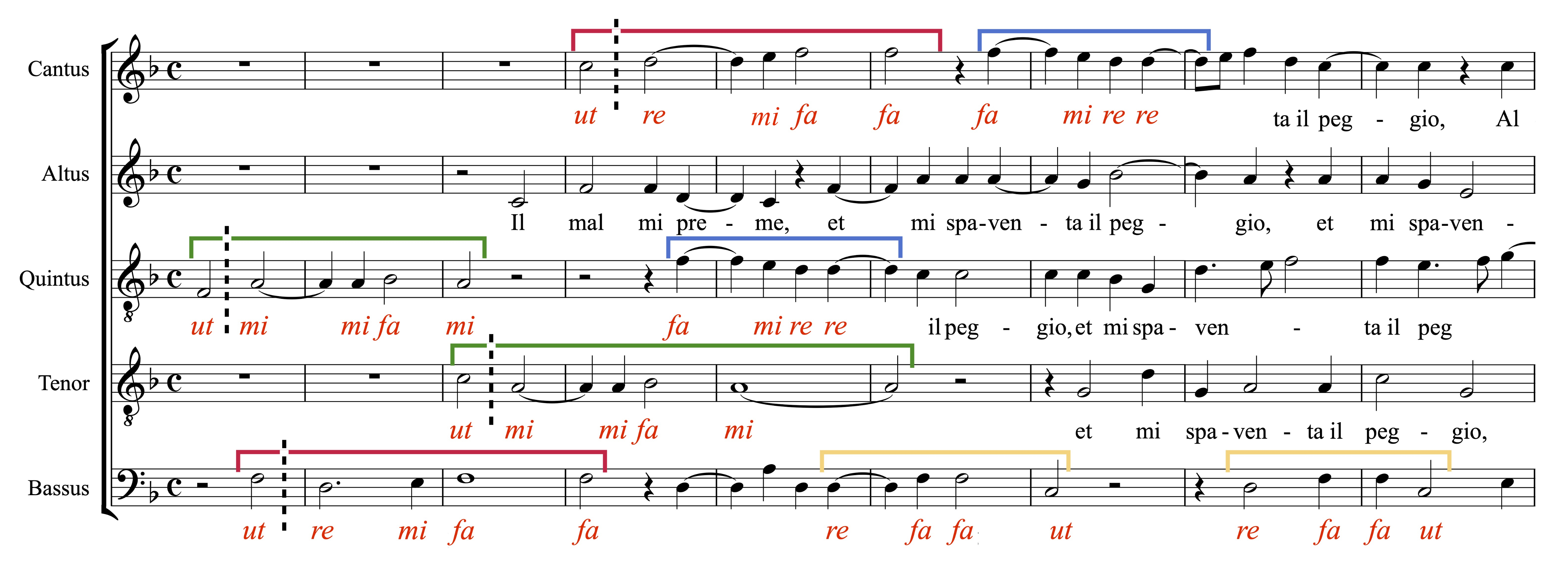 Example 10. The opening of #10 “Il mal me preme,” mm. 1–9. Switches of hexachord are indicated by dotted lines.