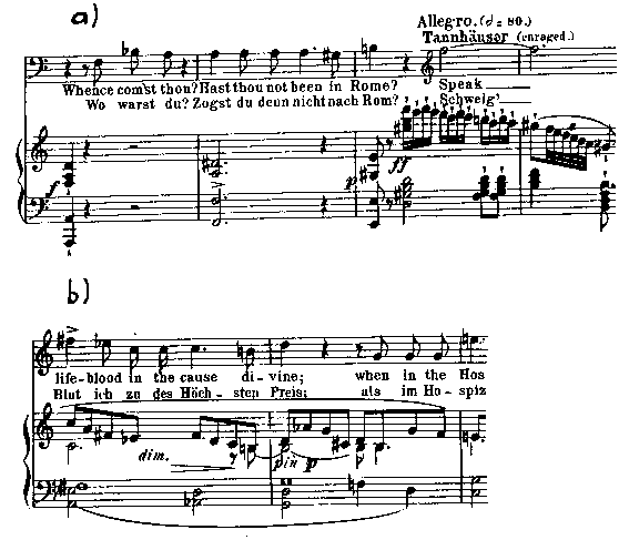 [10] The figure appears frequently in Act 3, Scene 3 of Tannhaeuser. While it is not always used to express a literal question, the figure's searching quality captures nicely the restless unfulfillment of Tannhaeuser's quest. Interestingly, almost all appearances of the figure in this scene are in either A minor or C major, precisely the two keys used at the beginning of Tristan. Ex. 5 shows two of the figure's occurrences. The first, in A minor, sets a question from Wolfram to Tannhaeuser: "Zogst du denn nicht nach Rom? (Didn't you go to Rome?)"